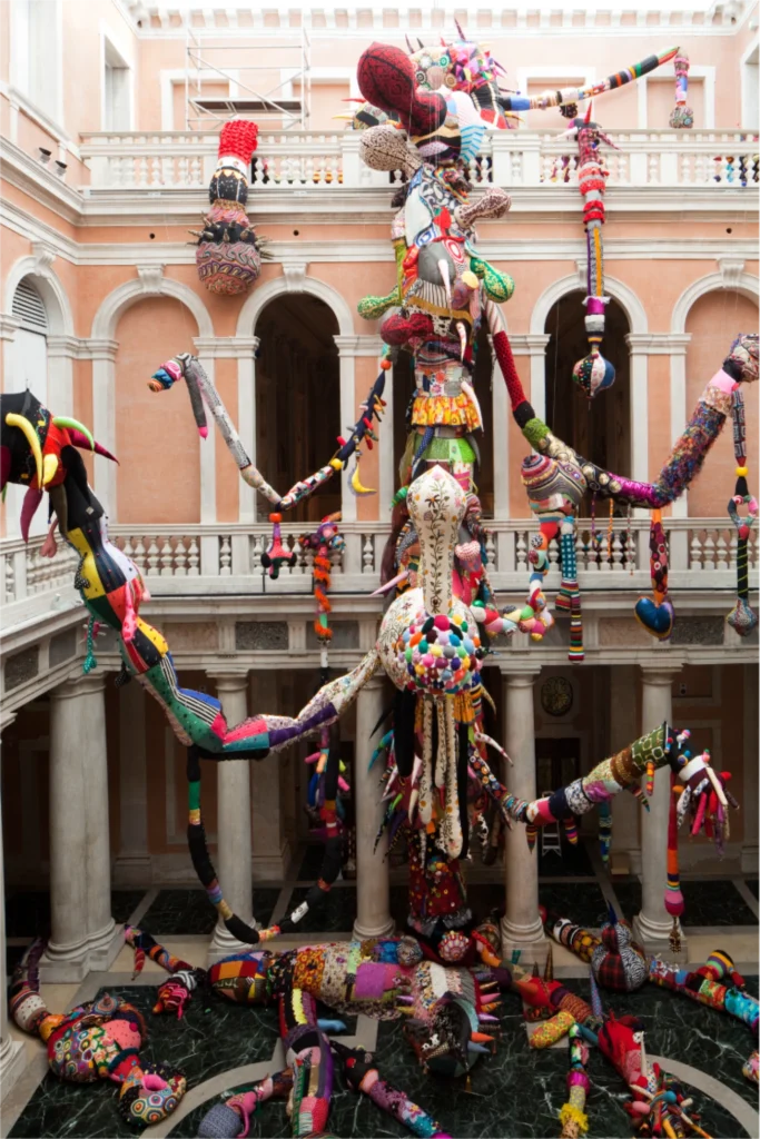 A exposição foi um triunfo estrondoso: críticos elogiaram como ela dialogava com o barroco francês, subvertendo a pompa real com materiais do quotidiano num espelho irónico à opulência do passado. A imprensa internacional, do The New York Times ao Le Figaro, destacou a ousadia de uma portuguesa que trouxe cor e humor a um palácio de mármore e dourado, provando que a arte contemporânea pode dançar com a história sem perder o ritmo. Dali, veio o convite para representar Portugal na Bienal de Veneza de 2013, com “Trafaria Praia”, uma galeria flutuante ancorada num barco de pesca tradicional, que misturou arte, performance e convívio popular – um cacilheiro convertido em palco vivo, onde visitantes navegavam entre azulejos, música ao vivo e petiscos, celebrando a alma marítima e festiva de Lisboa no coração da laguna veneziana.