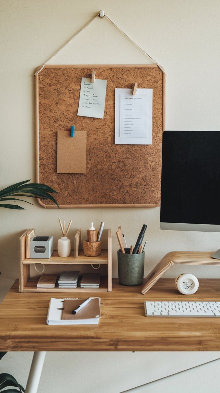 Um workspace bem organizado aumenta a eficiência. Mantém apenas o essencial à vista e arruma o resto em gavetas ou caixotes decorativos. Um caderno ou planner de mesa, algumas canetas coloridas e um porta-lápis bonito ajudam a sentir que cada objeto tem propósito, ao mesmo tempo que dá um toque de personalidade. A desordem visual provoca stress e distração, portanto, combina funcionalidade com estética: pensa em cada elemento como parte de uma harmonia que contribui para o teu conforto mental e físico.
