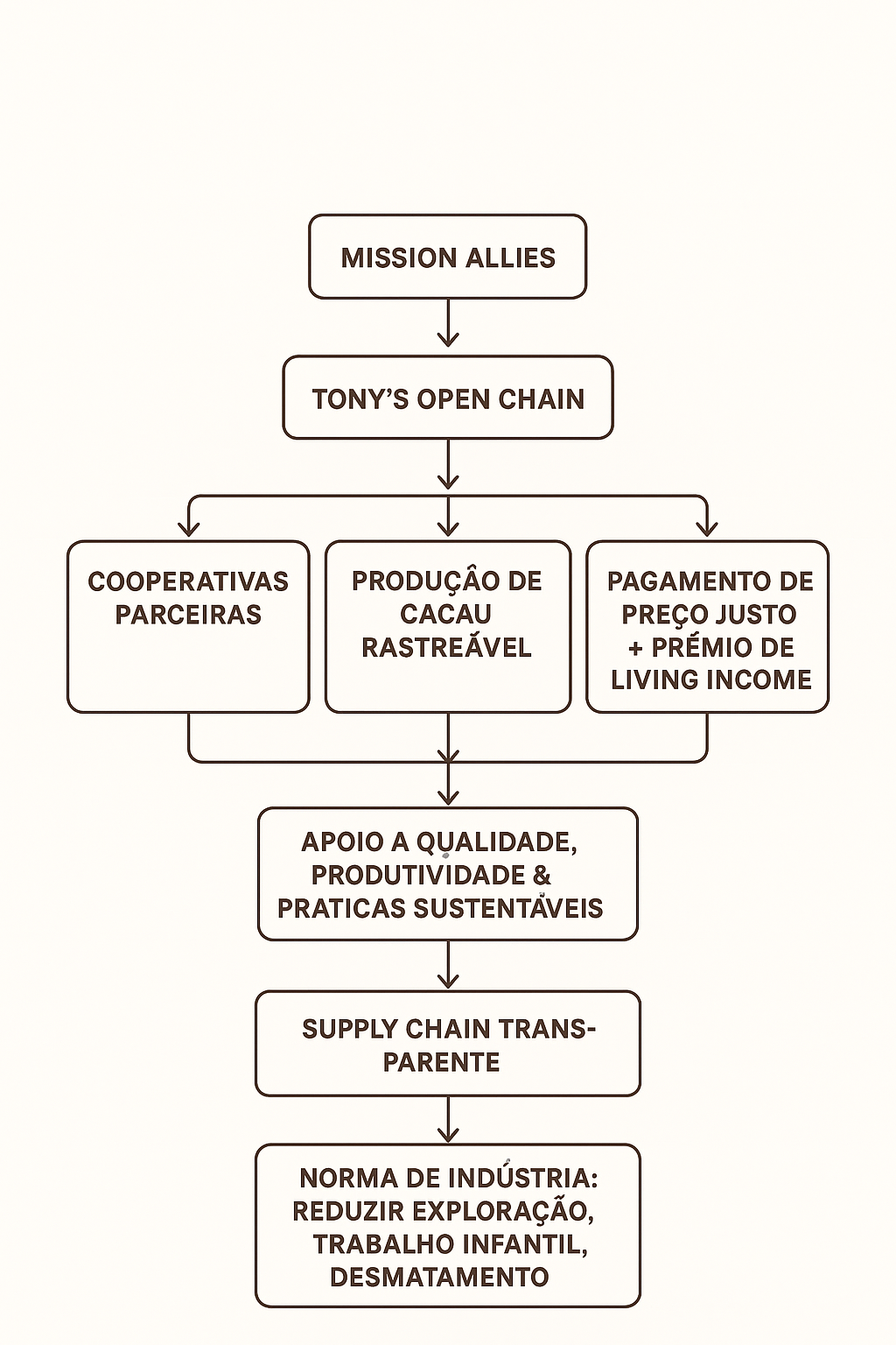 A marca adotou uma abordagem proativa para combater a exploração no setor do cacau, criando a Tony’s Open Chain. Uma plataforma que convida outras marcas de chocolate a adotarem os mesmos princípios de fornecimento ético da empresa. Em vez de manter práticas exclusivas só para si, a empresa decidiu “abrir a corrente” e partilhar o seu modelo com a indústria inteira.
